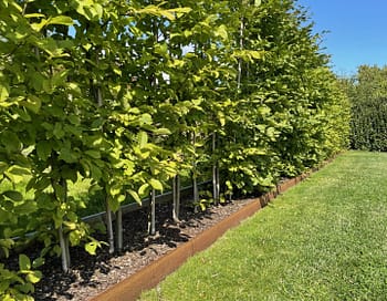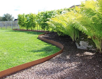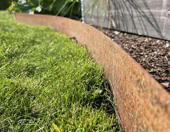 Kraftig rabattkant av 2 mm rosttrögt cortenstål. Plåtarna levereras med skarvplåt och bult, vilket ger en snygg sammanfogning utan överlappning. Plåtarna som finns i två olika höjder, 19 samt 30 cm, är enkla att forma och böja. Cortenplåt är trögrostande och står sig mycket bra. Den rostiga färgen kommer först efter en tid utomhus.