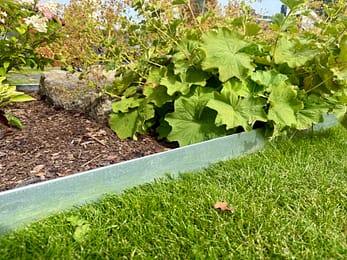 Vår höga rabattkant är 18 cm hög och tillverkad i 1 mm förzinkad plåt. Plåten är dubbelbockad i överkant för att inte vara vass att stiga på. Rabattkanterna sammanfogas med skruv och mutter och är enkla att forma och böja. Minst halva rabattkantens höjd bör ligga under jord, för att kanten ska bli så stabil som möjligt.