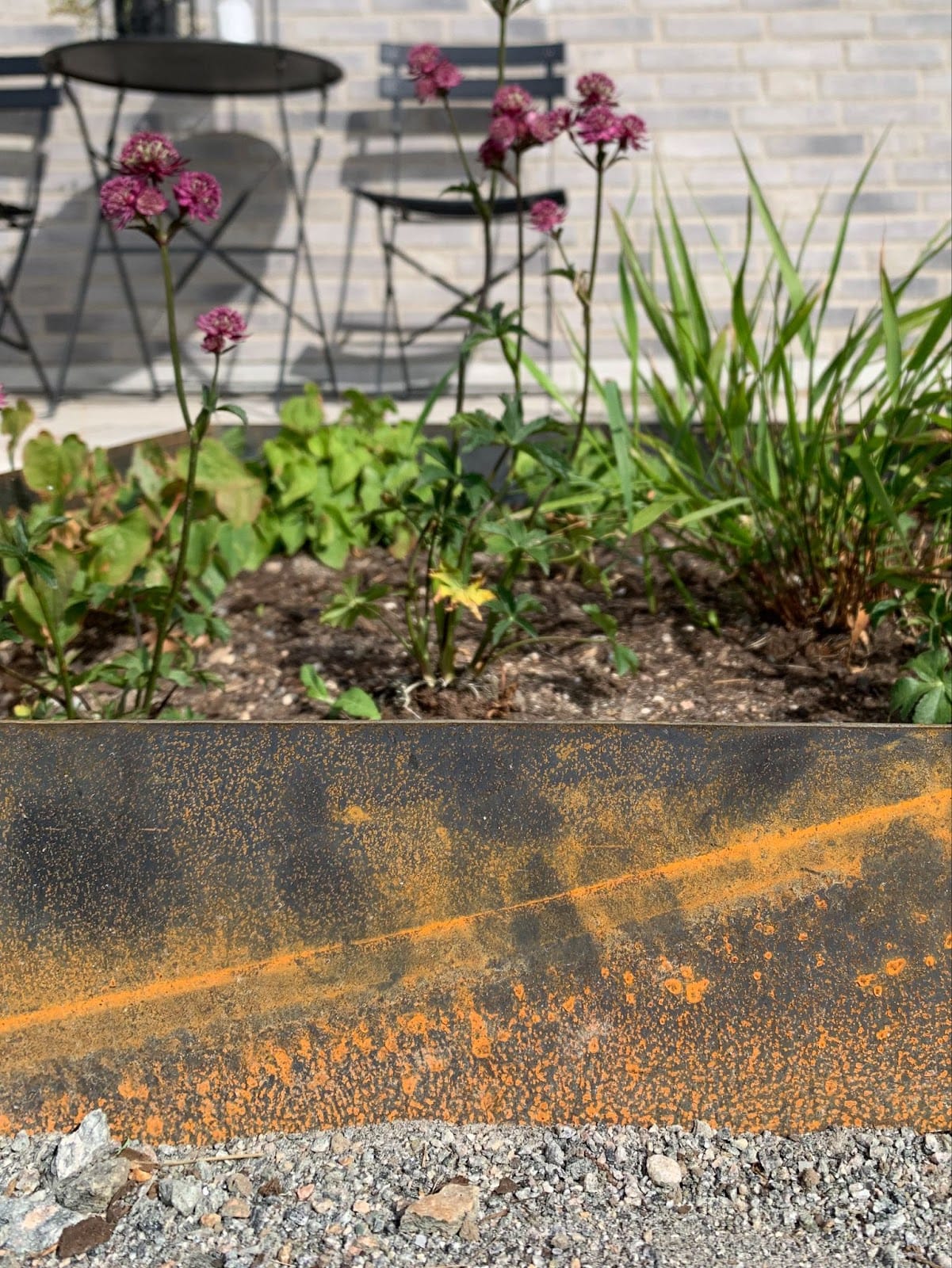 Vår serie Plant Box har matchande planteringskärl i cortenlack. På så vis kan du matcha dina rabattkanter och trädringar i cortenplåt.