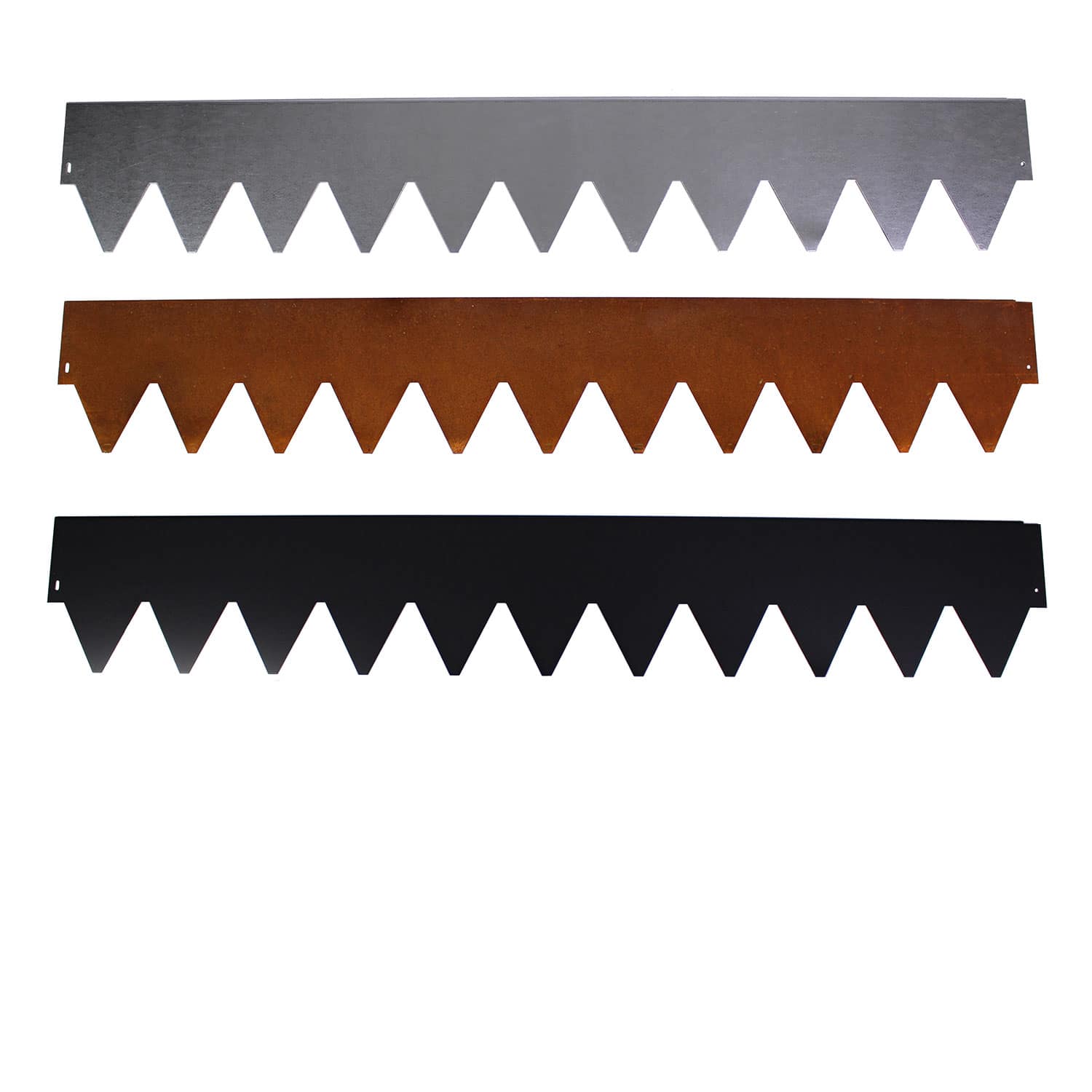 Rabattkanterna finns i tre färger; galvat, svart och trögrostande corten. Förzinkad plåt ger ett bra skydd mot rost och lacken är en väderbeständig pulverlack för utomhusbruk. Rabattkanten i corten får sin rostiga yta först efter en tid utomhus. Vi rekommenderar att den svartlackerade kanten böjs varsamt och ej i skarpa 90 graders hörn. Detta då risken finns att färgen spricker.