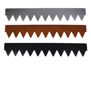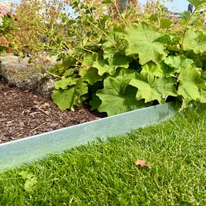 Vår höga rabattkant är 18 cm hög och tillverkad i 1 mm förzinkad plåt. Plåten är dubbelbockad i överkant för att inte vara vass att stiga på. Rabattkanterna sammanfogas med skruv och mutter och är enkla att forma och böja. Minst halva rabattkantens höjd bör ligga under jord, för att kanten ska bli så stabil som möjligt.