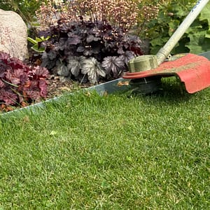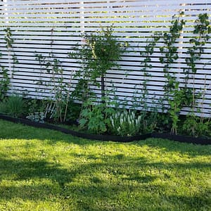 Vår höga rabattkant är 18 cm hög och tillverkad i 1 mm förzinkad plåt. Plåten är dubbelbockad i överkant för att inte vara vass att stiga på. Rabattkanterna sammanfogas med skruv och mutter och är enkla att forma och böja. Minst halva rabattkantens höjd bör ligga under jord, för att kanten ska bli så stabil som möjligt.