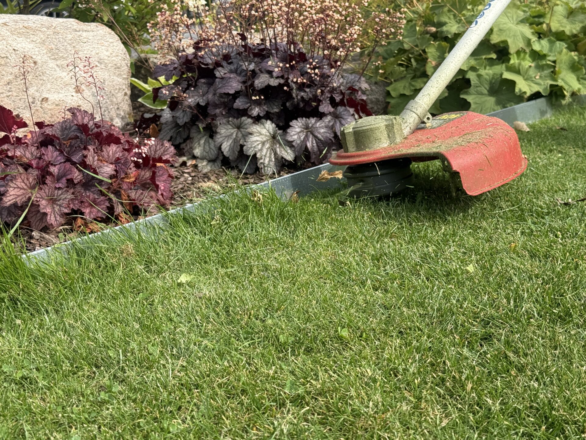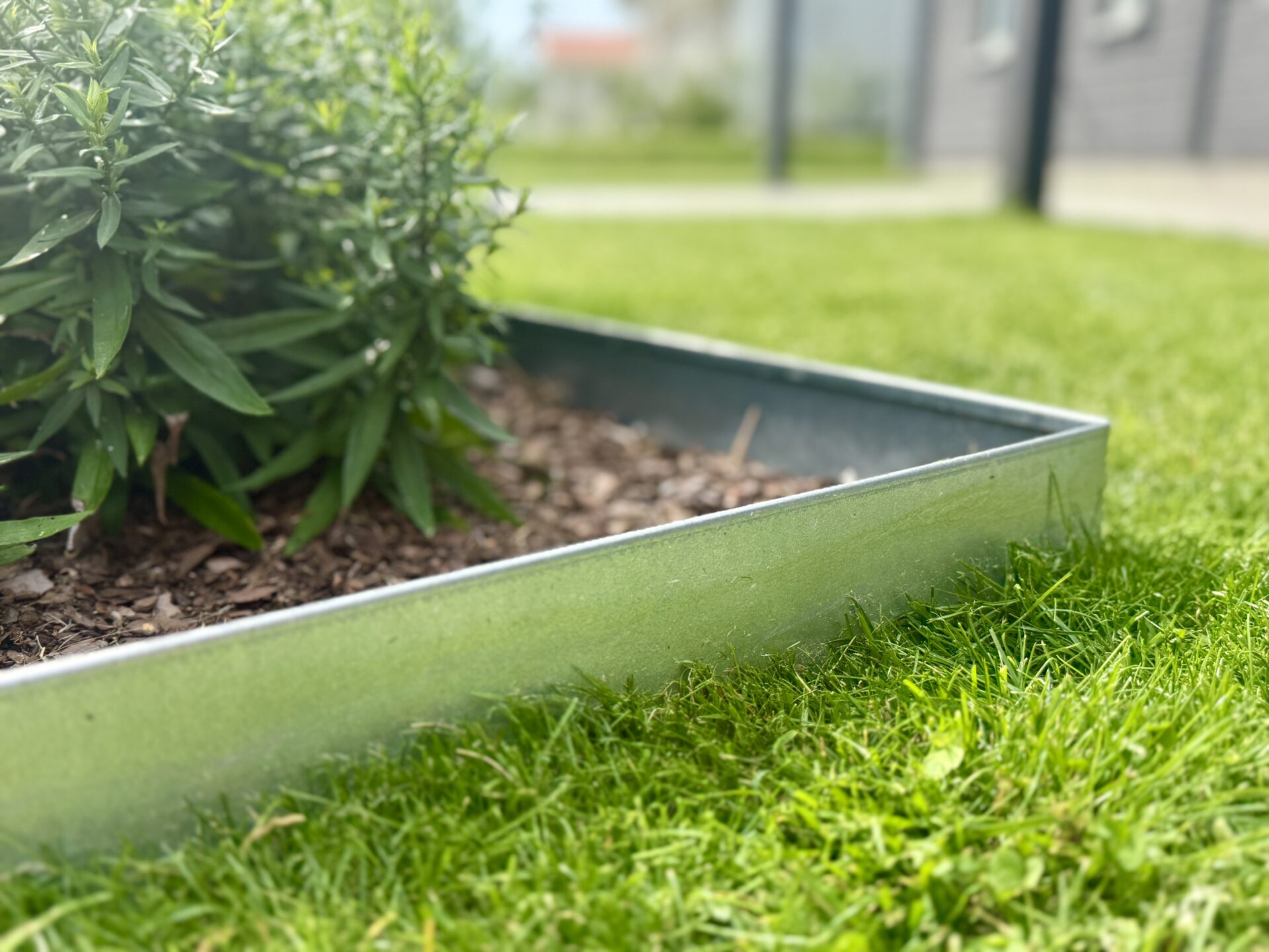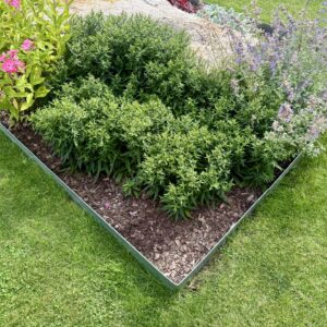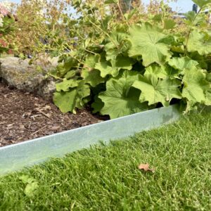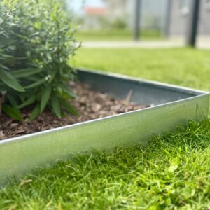 Vår höga rabattkant är 18 cm hög och tillverkad i 1 mm förzinkad plåt. Plåten är dubbelbockad i överkant för att inte vara vass att stiga på. Rabattkanterna sammanfogas med skruv och mutter och är enkla att forma och böja. Minst halva rabattkantens höjd bör ligga under jord, för att kanten ska bli så stabil som möjligt.