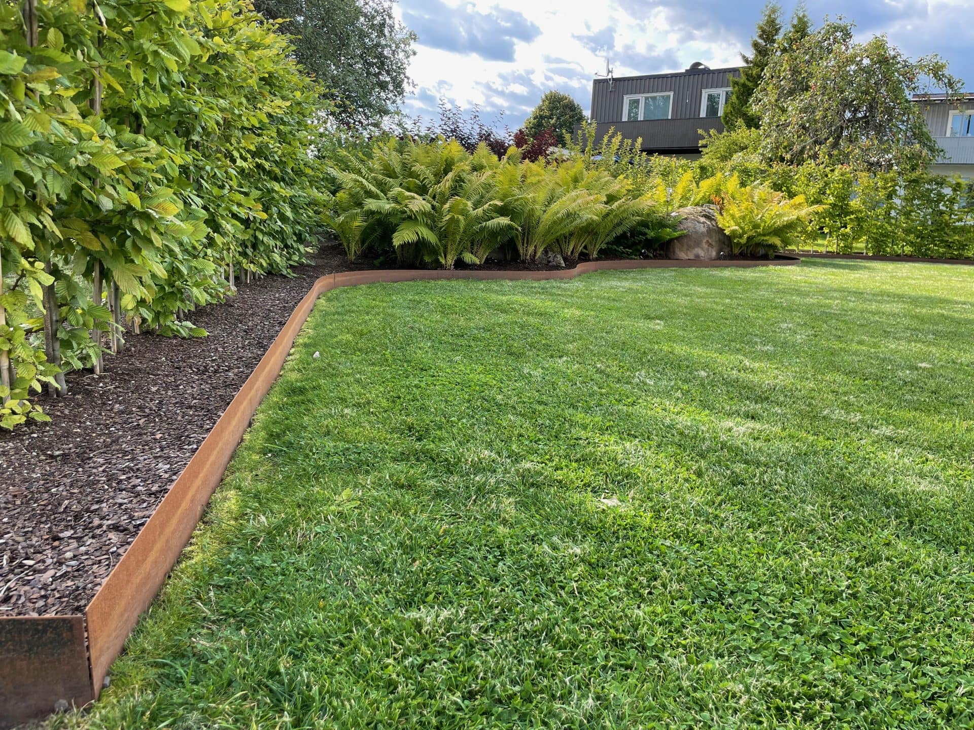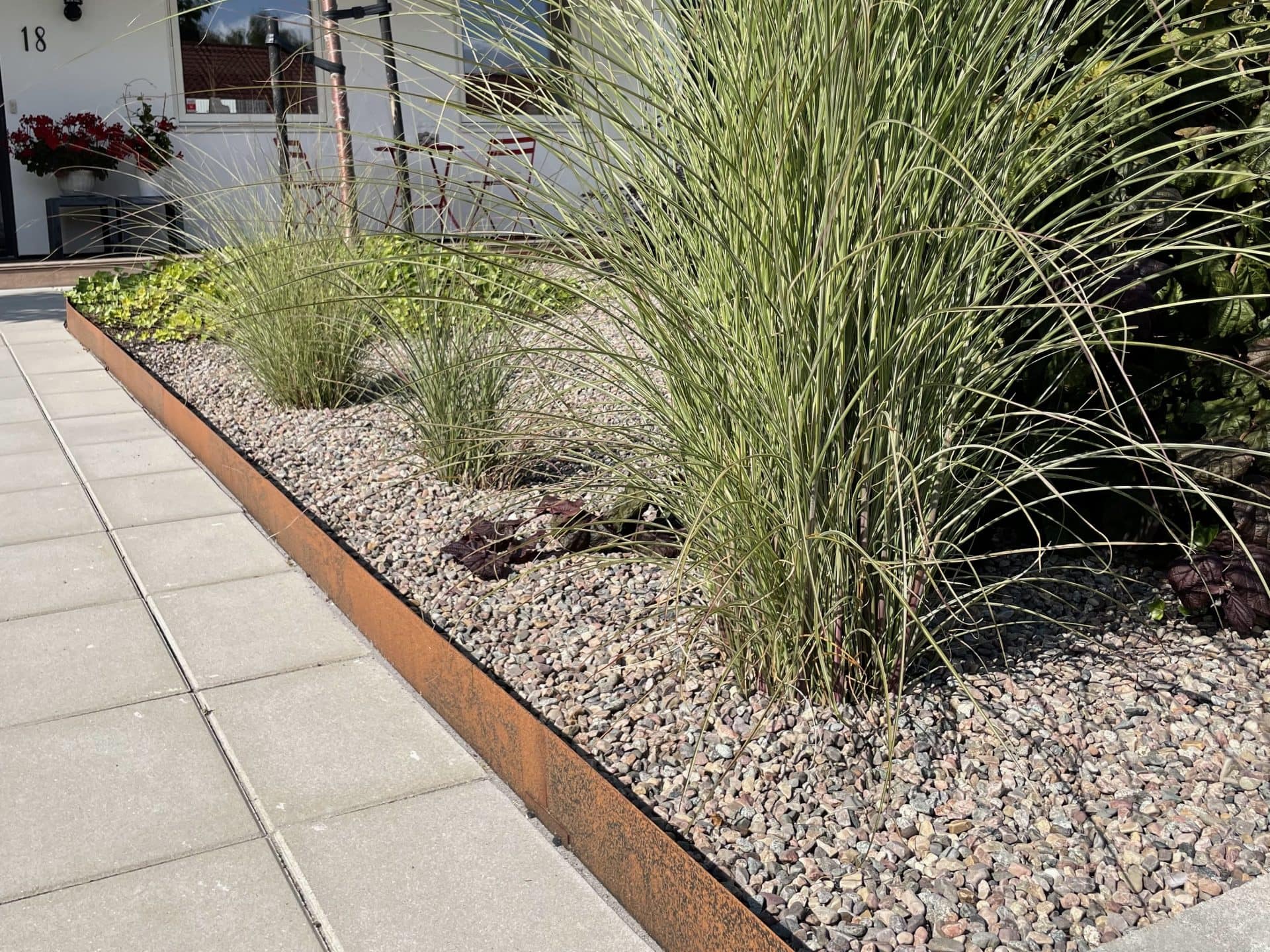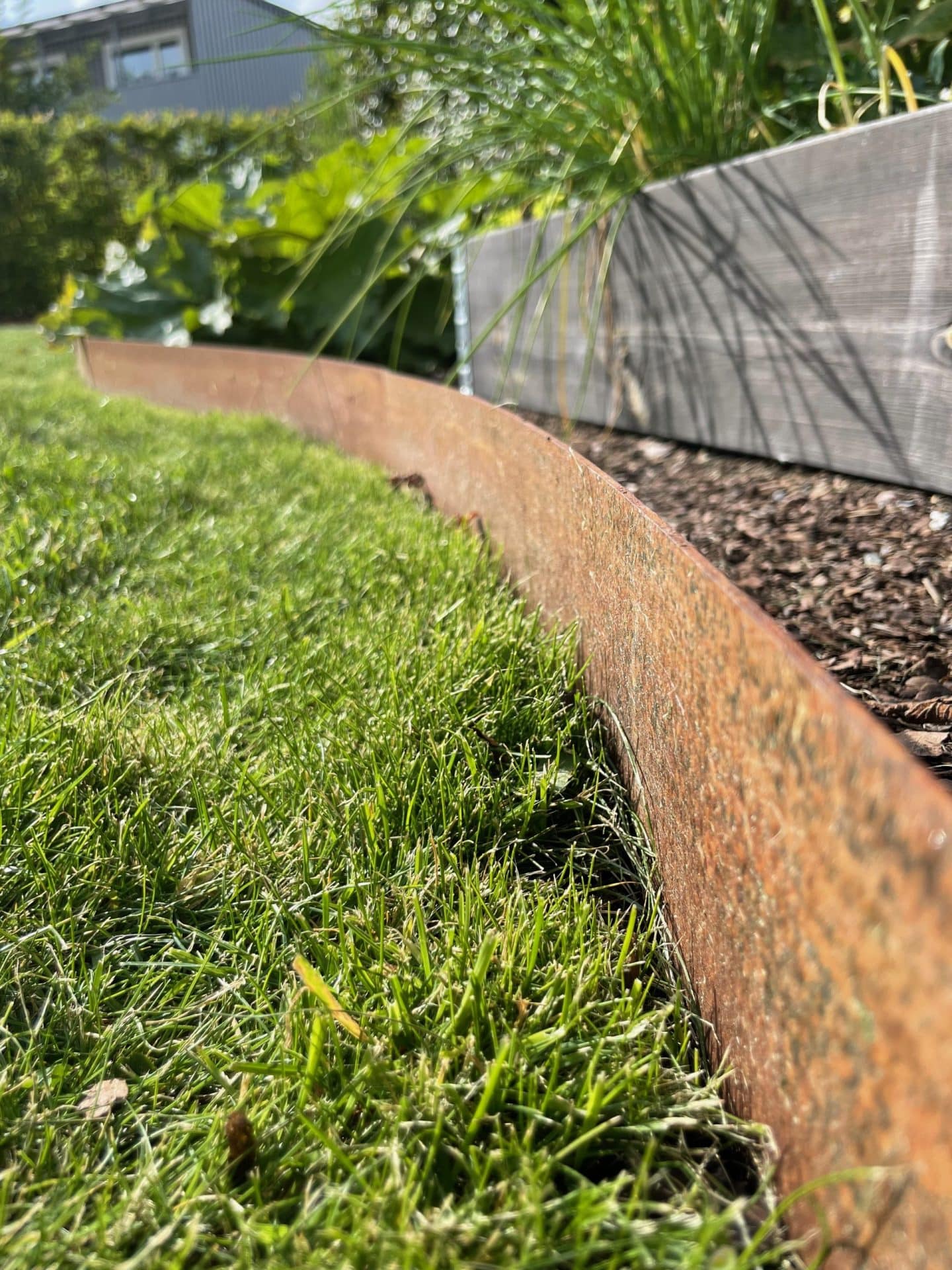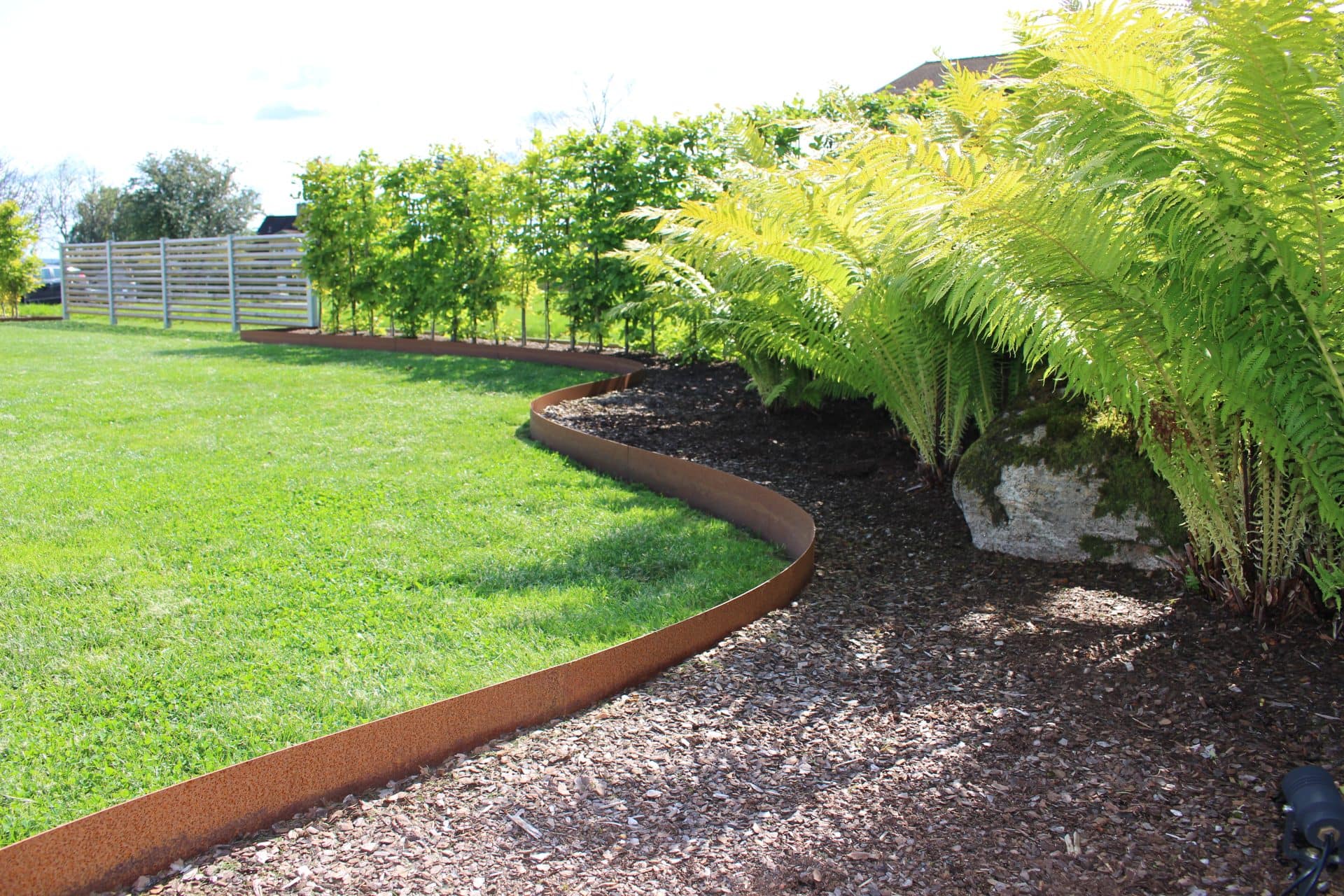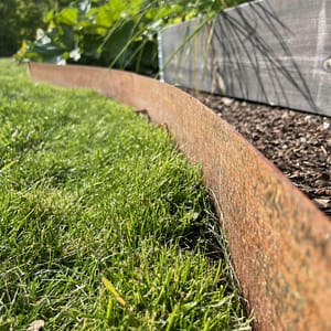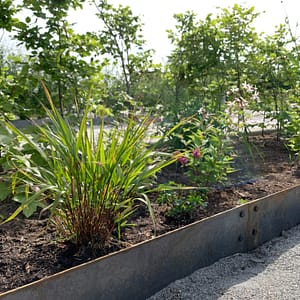 Kraftig rabattkant av 2 mm rosttrögt cortenstål. Plåtarna levereras med skarvplåt och bult, vilket ger en snygg sammanfogning utan överlappning. Plåtarna som finns i två olika höjder, 19 samt 30 cm, är enkla att forma och böja. Cortenplåt är trögrostande och står sig mycket bra. Den rostiga färgen kommer först efter en tid utomhus.