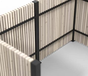 Soptunneskydd Borgen är en förlängning av vårt älskade Ribbstaket Borgen. Soptunneskyddet består av fem stycken Borgen staketstolpar, profiler och tillbehör som kombineras med träribbor. Profilerna har utskurna hål för träribbor 28×45 mm som skruvas fast med skruv genom baksidan av profilen. Träribborna köps separat i bygghandeln, vilket gör att du enkelt kan sätta din egen prägel på soptunneskyddet. Skyddet är 110 cm högt, 203 cm brett och 105 cm djupt.