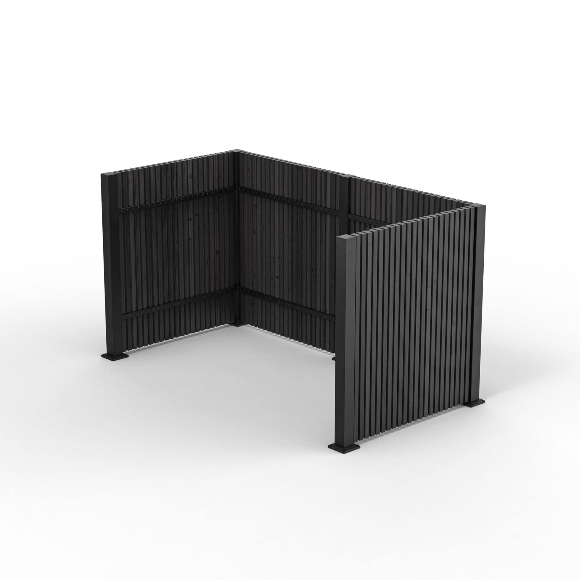 Soptunneskydd Borgen är en förlängning av vårt älskade Ribbstaket Borgen. Soptunneskyddet består av fem stycken Borgen staketstolpar, profiler och tillbehör som kombineras med träribbor. Profilerna har utskurna hål för träribbor 28×45 mm som skruvas fast med skruv genom baksidan av profilen. Träribborna köps separat i bygghandeln, vilket gör att du enkelt kan sätta din egen prägel på soptunneskyddet. Skyddet är 110 cm högt, 203 cm brett och 105 cm djupt.