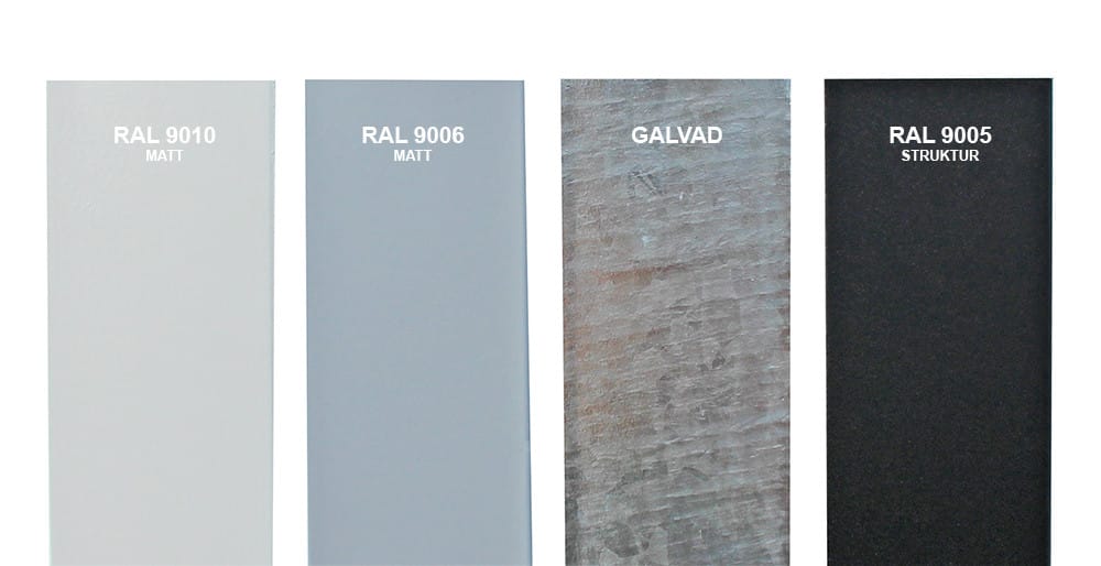 Lack: | Väderbeständig pulverlack - mattsvart (RAL 9005), vit (RAL 9010) & grå (RAL 9006) |