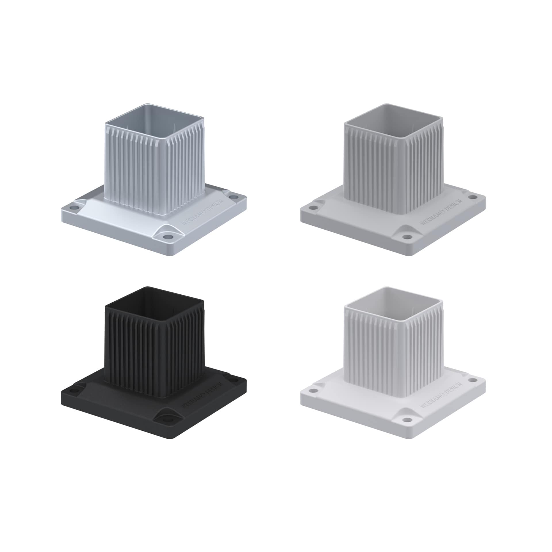 Formgjuten stolpfot i zink för montering på exempelvis mur eller altandäck. Finns i fyra olika färger.