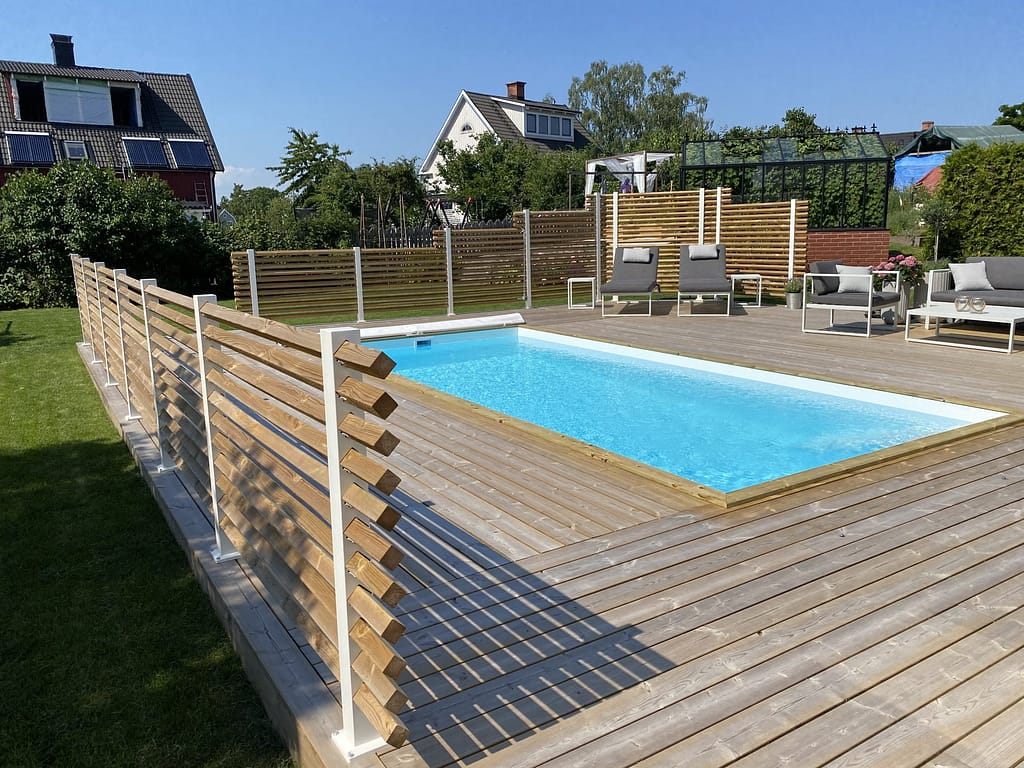 Ett högre altanräcke kan ha många olika fördelar. En av dem är att det fungerar utmärkt som insynsskydd. Även om du gillar dina grannar och inte störs mycket av förbipasserande så kan det vara skönt att få lägga sig i solstolen, med en ljudbok i öronen, ifred. Du kanske har ett spabad, badtunna eller pool på altanen och vill att du och dina gäster ska bada utan nyfikna blickar? Våra staket/altanräcken Drömminge och Nydala är perfekta att använda som insynsskydd. Genom att komplettera stolpar, stolphatt och stolpfot med träreglar från valfri bygghandel får du ett perfekt skydd som släpper igenom lagom mycket ljus men har ändå så pass lite avstånd mellan reglarna att det skyddar bra mot insyn. Drömminge har dessutom hål för träreglar som är ett kvarts varv vridna vilket gör att staketet ger ytterligare ett ökat skydd mot insyn.